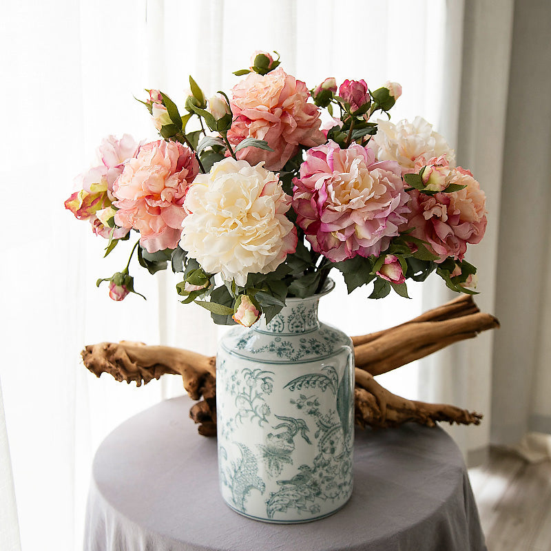 Gorgeous faux peonies, arranged in a beautiful vase, will delight you forever!